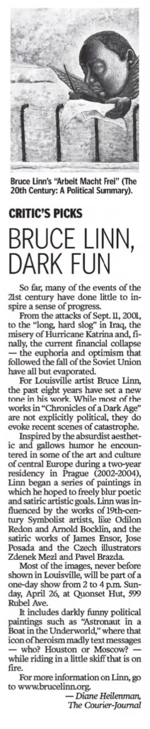While recognized for his paintings, Bruce Linn has explored multiple disciplines and media. As a singer, lyricist, and musician, Linn was the front man for a number of bands, including “Folks On Fire” (Louisville, 1980s) and “Adult Entertainment” (Chicago, 1990s). In 2013, he began to write and self produce Web videos that combine his visual imagery with sound and, both, poetic and satiric narrative.